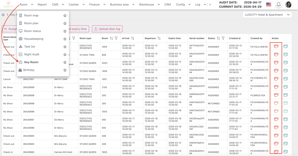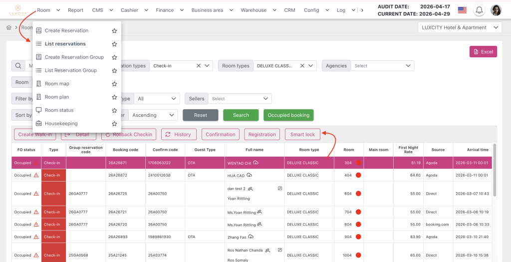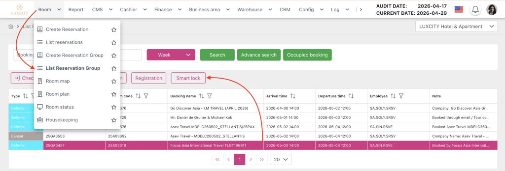 Navigation: Room > List reservation, search and select booking code then click “Smart lock” button