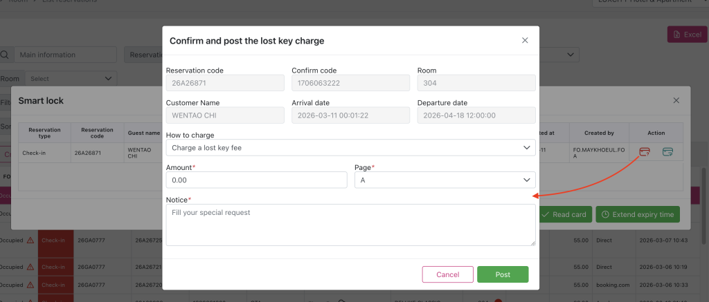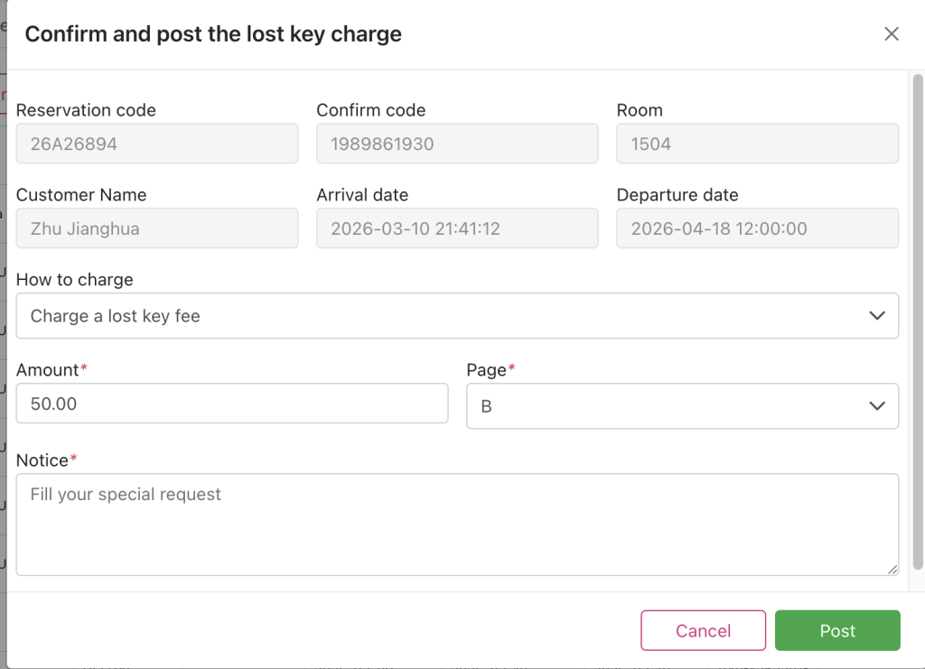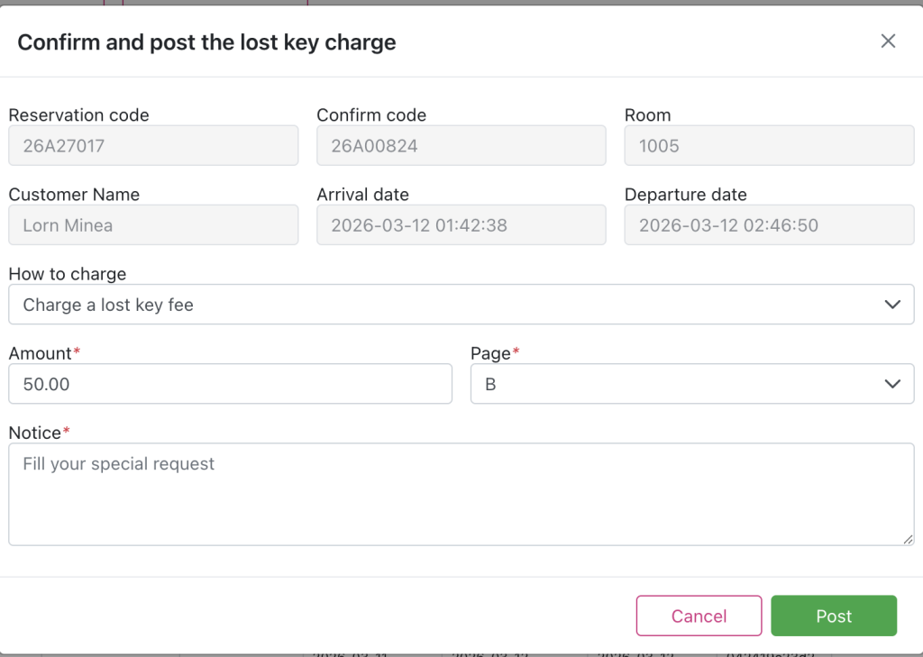 click a “Lost key” icon to show “Confirm and post lost key charge” pop up to select how to charge (Charge a Lost key fee / No charge) and fulfill amount, page and notice > Save