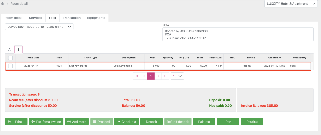 Result: After post at (2.1), (2.2), (2.3), (2.4), the transaction of Key lost will be under Folio of Booking detail: