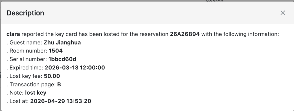 Aim: when guest lost key that assigned when checking in, Fo staff will inform guest and charge the fee on system