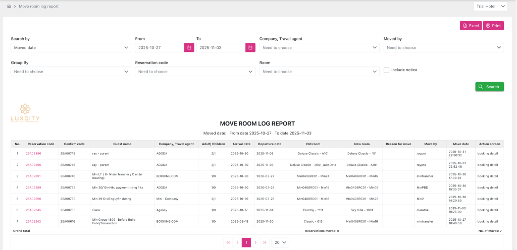 - Old room: Room is assigned to booking before move room operation. Display format: @Room type name- @Room, for example: STD – 301