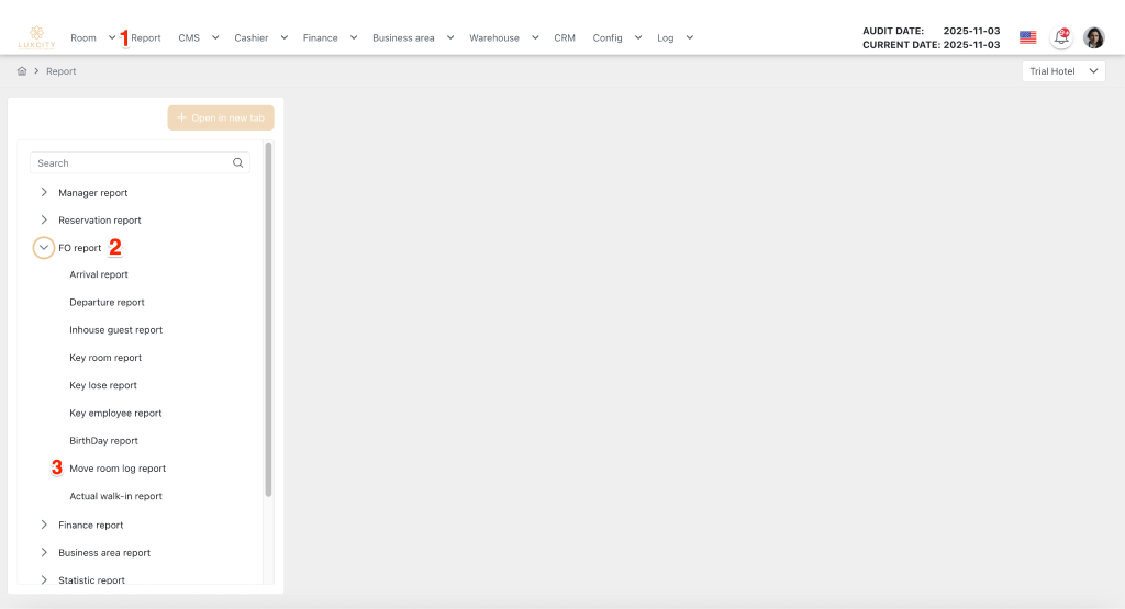Nagivation: Report menu (1) > FO report (2) > Move room log report (3)