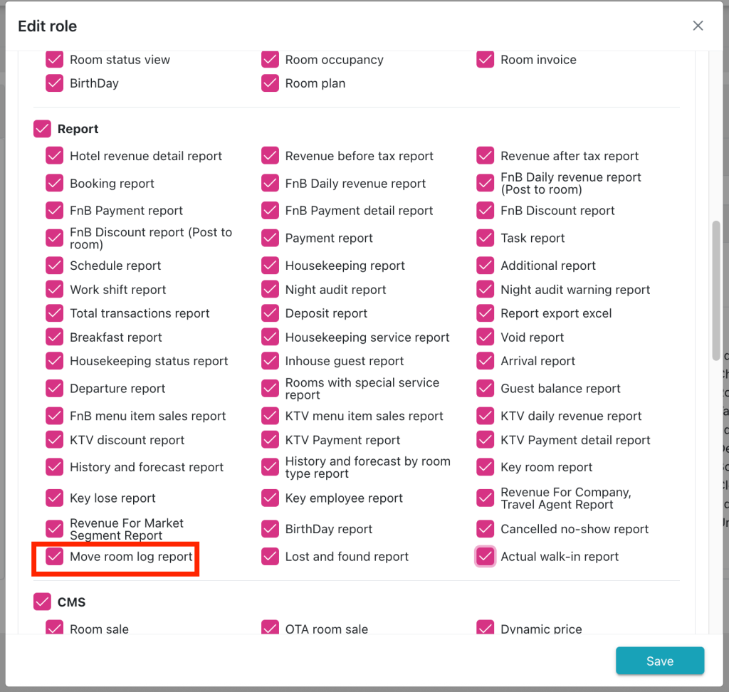Add permission Move room log Report vào Config > Access Control, Report section: