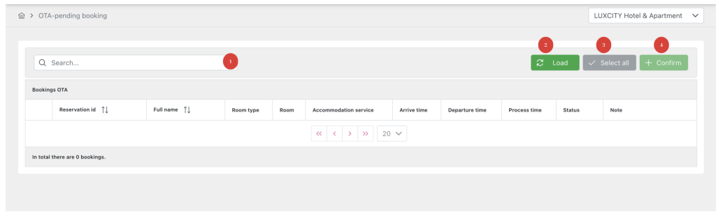 Search button (1): allow to search OTA bookings based on confirmed code, guest name, room type,…