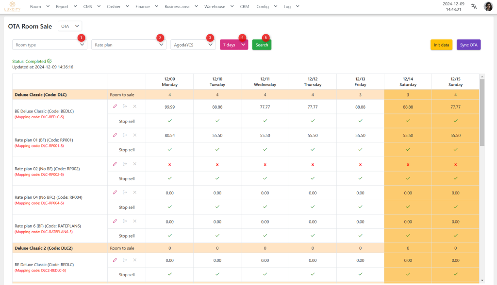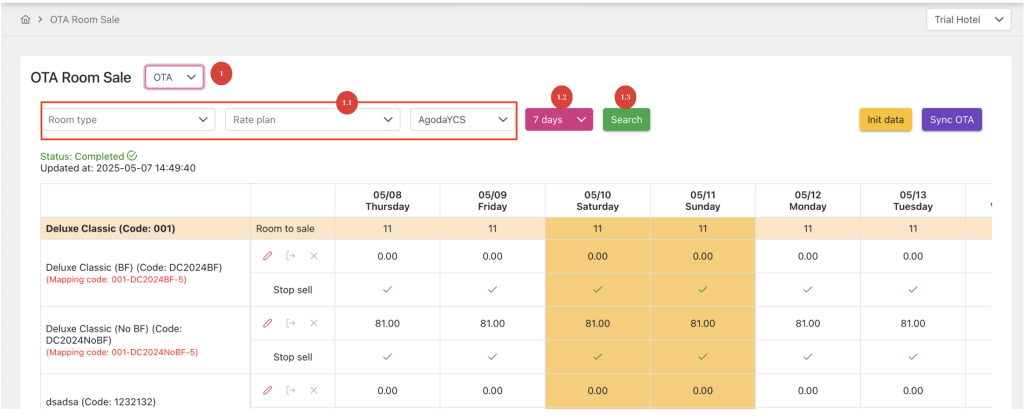 - Filter Room type/ Rate plan/ a specific OTA channel (1.1) > Search (1.2)