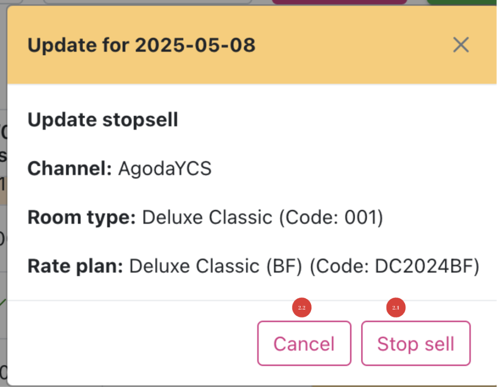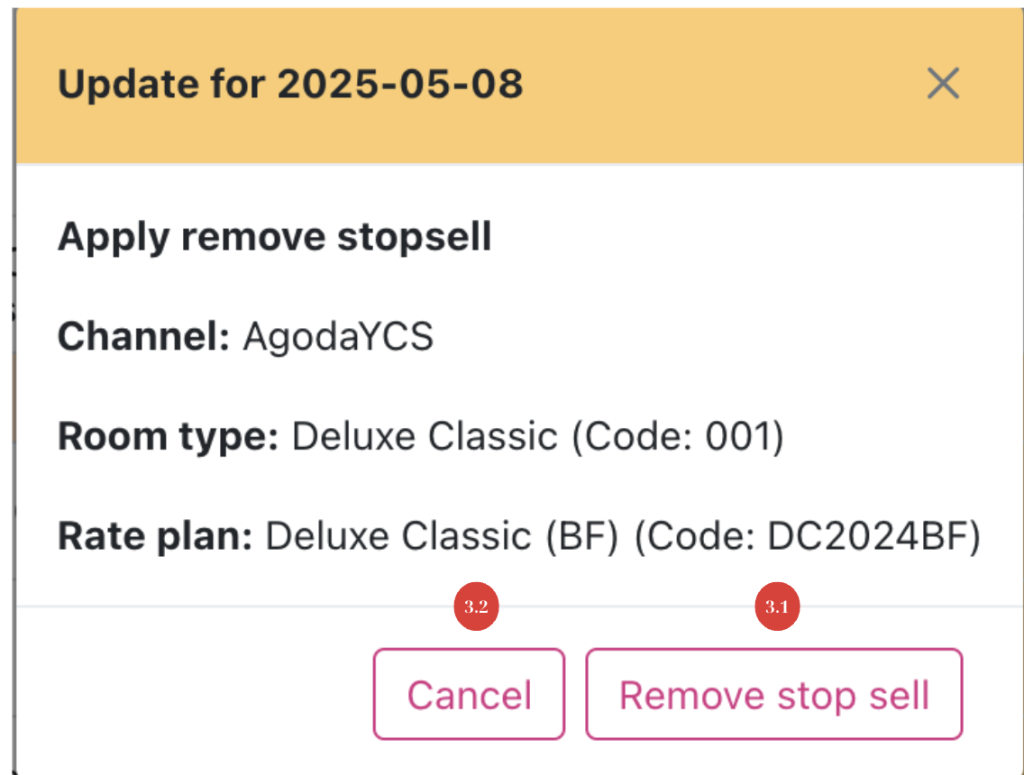 Step 3: After selecting Stop sell (2.1) button > check icon will change “x” (3) > Click