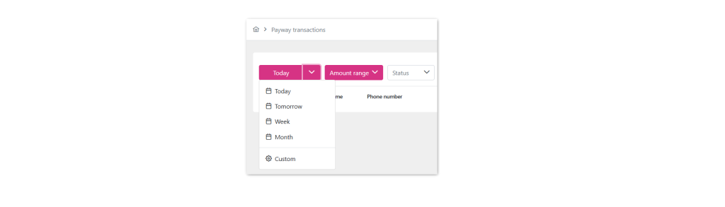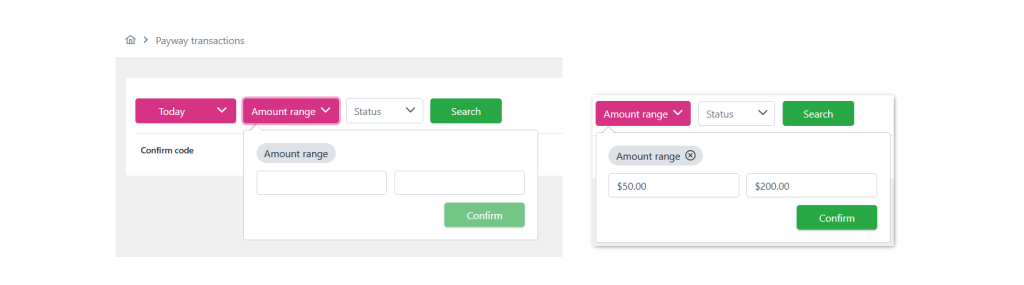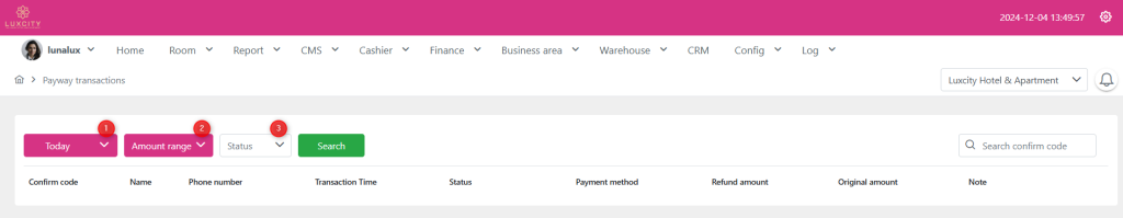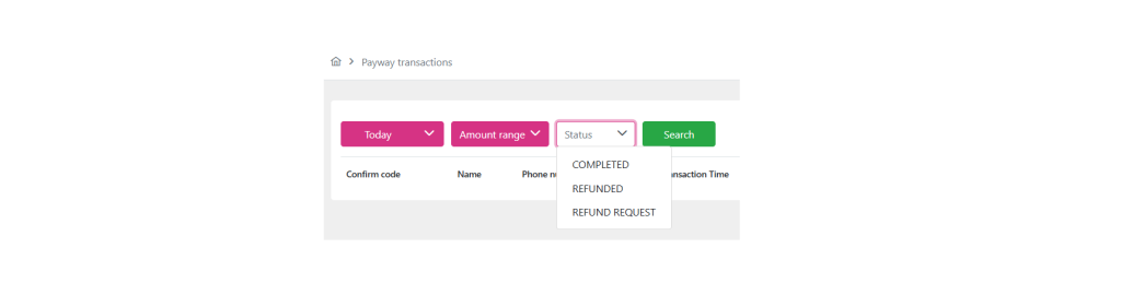 Step 1: On the Payway transactions page, you can filter transactions by time (1), amount range (2), or transaction status (3).