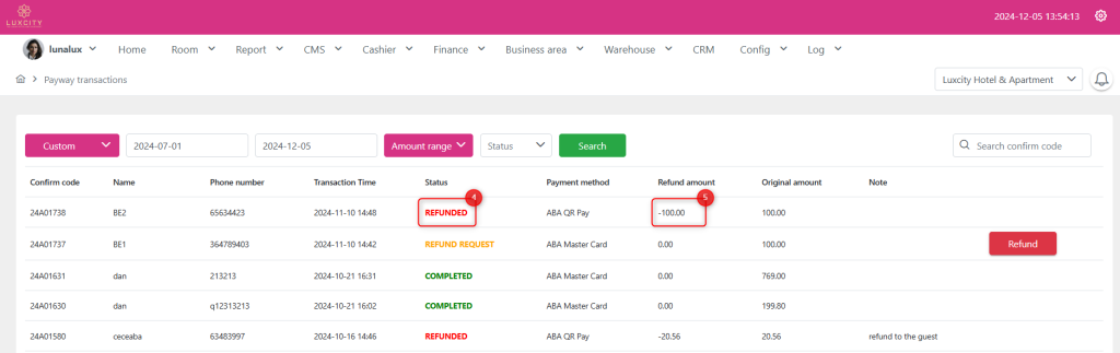 Result: The refund has been successfully processed. The status is updated to REFUNDED (4), and the refund amount is displayed (5).