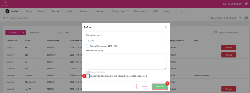 Step 2: Fill in the Refund amount (required field) and add a Remark (optional). Tick the confirmation checkbox (2) to enable the Confirm button (3), then click Confirm to complete the refund process.