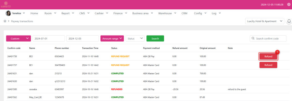 The Payway transactions page is designed to manage and track transactions made through the Payway payment gateway. Whenever a transaction occurs via ABA Payway, it will also be reflected on the Payway transactions page within the PMS, as the integration with ABA’s system is already established.