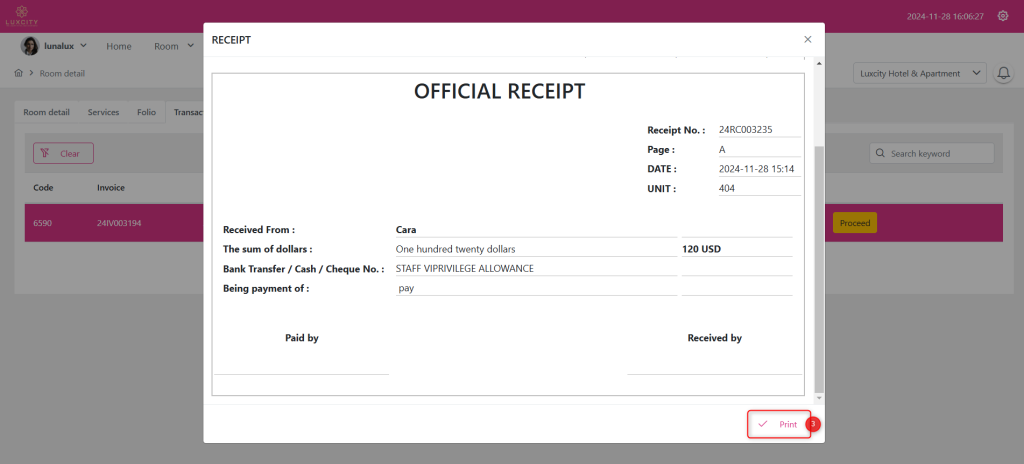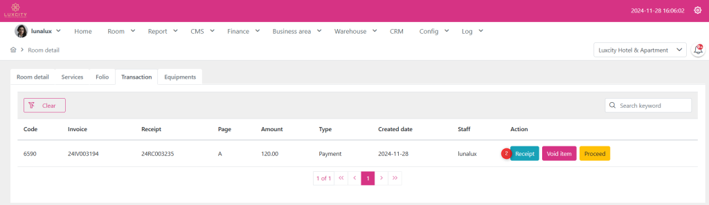Step 2: Go to the Transaction tab. Click the Receipt button (2), and the Receipt popup will appear.
