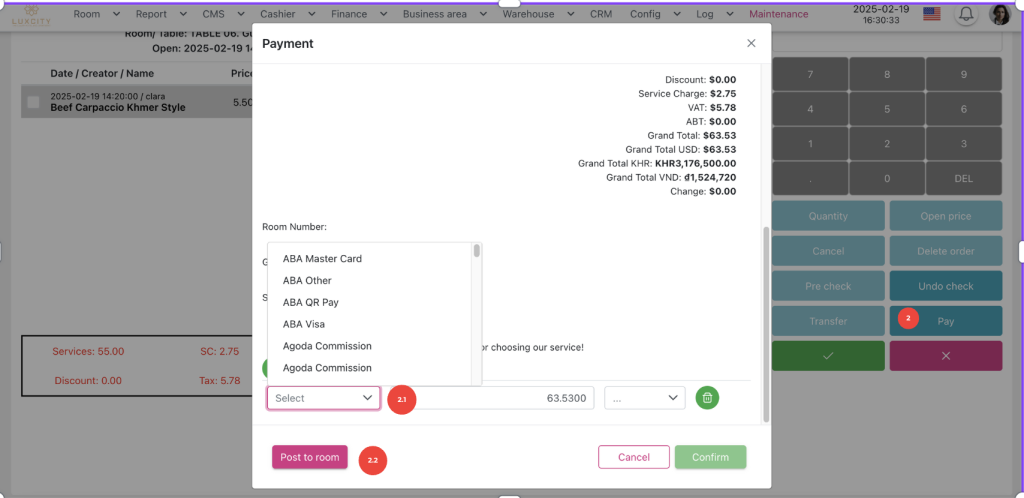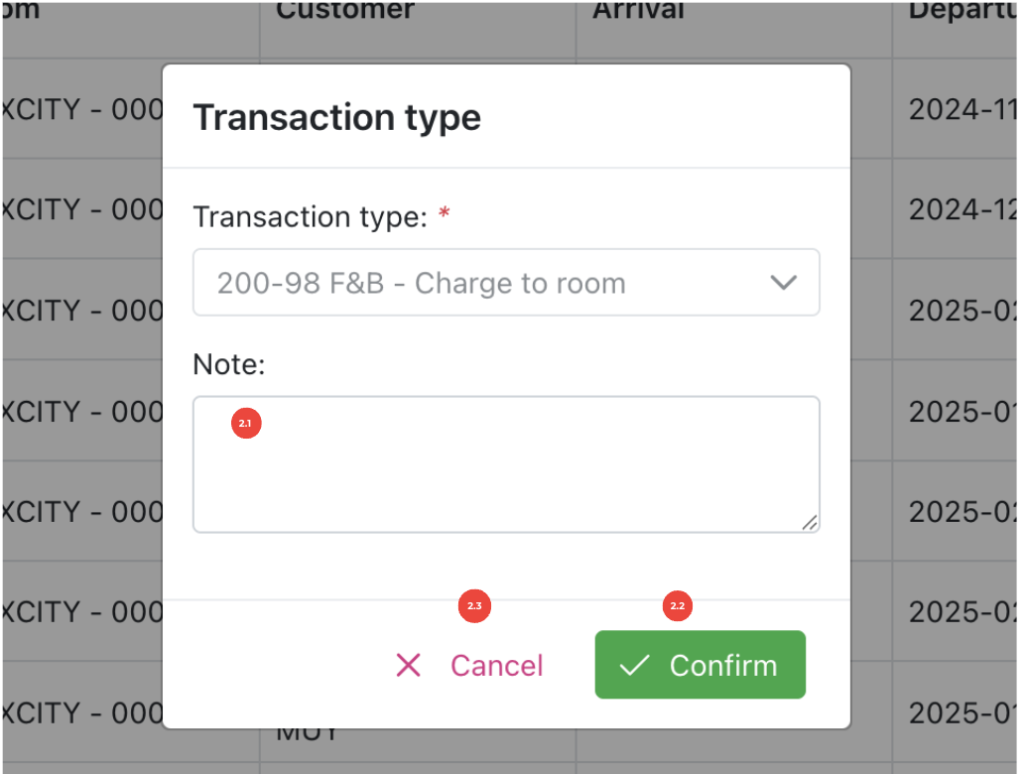 Confirm button (2.2): transfer the bill to selected room