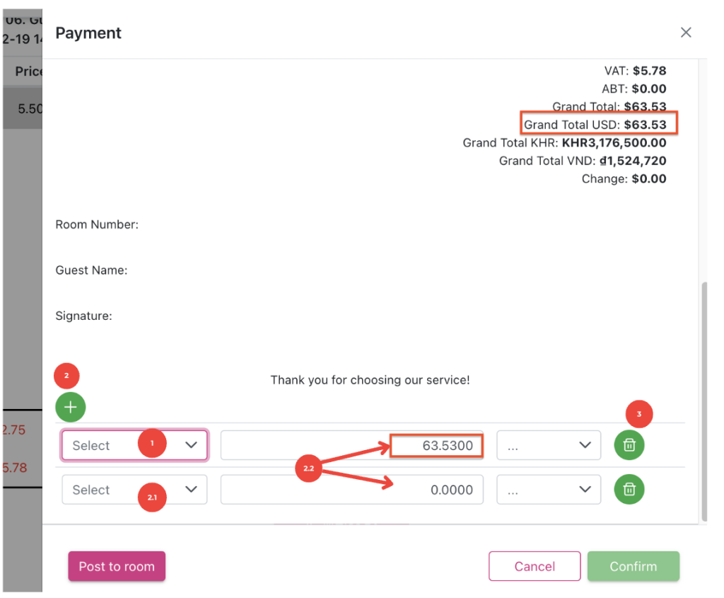 - Plus button (2): select the multiple payments type if guest pays more than a payment type. Need to select the second payment type (2.1) and input amount in Textboxs (2.2) correctly