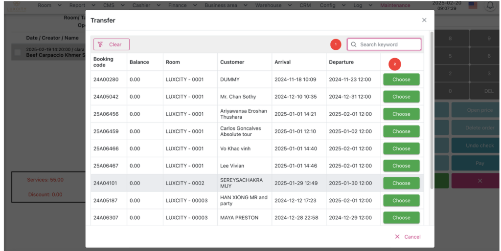 - Search bar (1): find the room with key words such as Booking code, Room number , Customer name, Arrival time (yy-mm-dd), Departure time (yy-mm-dd)