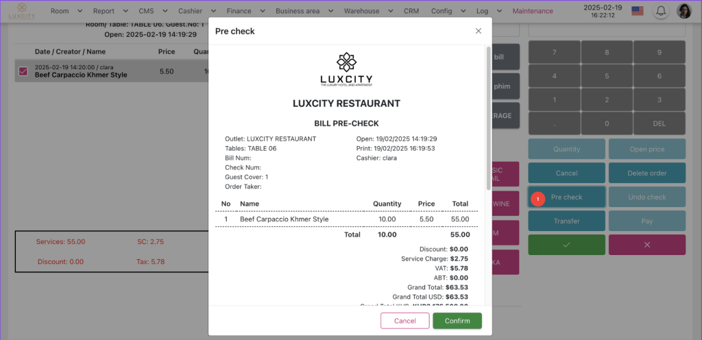 Step 1: Pre-check funtion (1) is for locking the table so that user cannot make change on the dish anymore. It allows customers to preview and review charges before officially charging.
