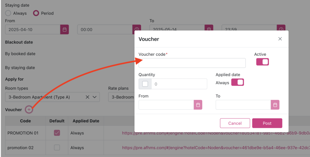 - Click Plus icon, a popup “Voucher” will appear allowing the user to fill in information to add a new voucher for the corresponding promotion.