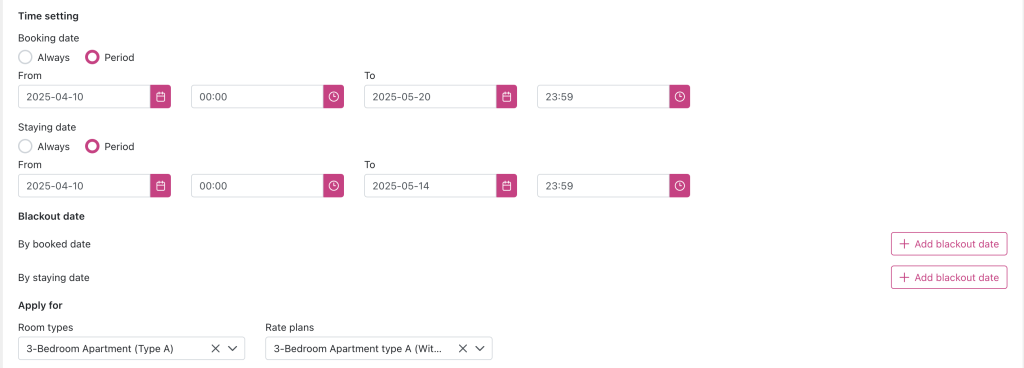 - Apply Booking date: Always or Period