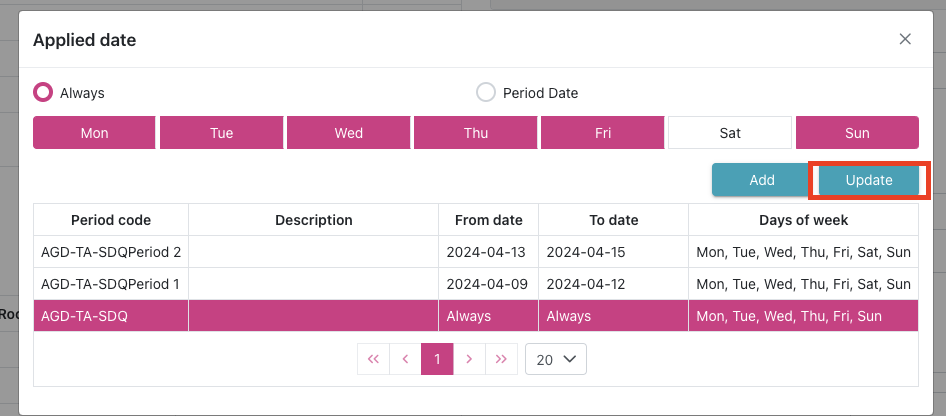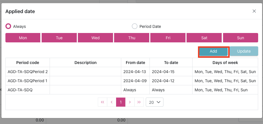 Option 1: Always means available from Monday to Sunday > Add, the period time will display in below table
