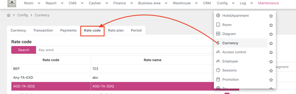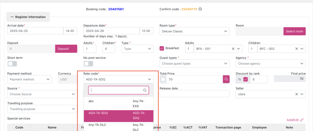 RESULT: the created rate code is displayed on Rate code section on Detail booking screen