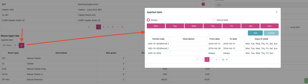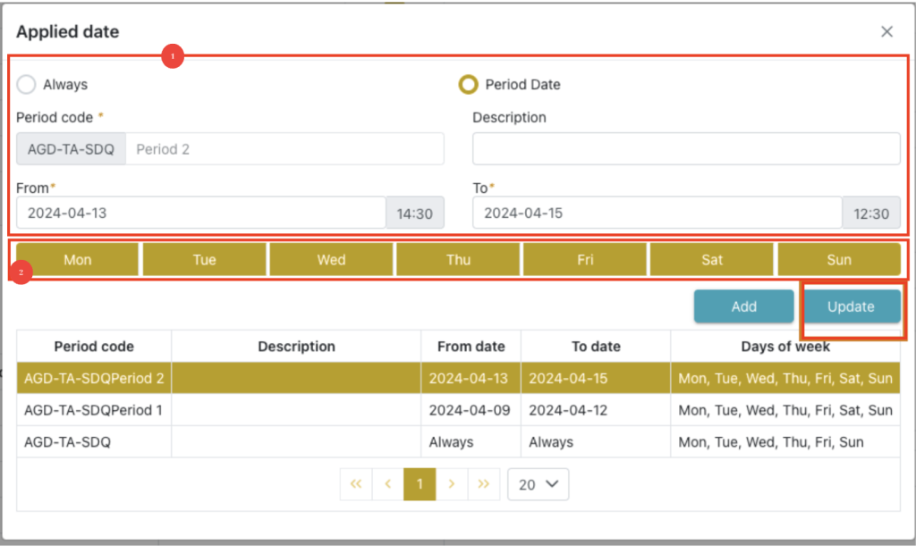 Option 2: Period Date, select range date (1) or/and enable/ disable the Day button (2) as hotel expect > fulfill information of fields > Add