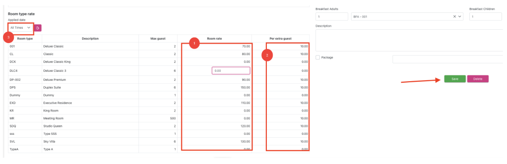 Step 3: Input amount for room rate (1) and Per extra guest (2) for each room type