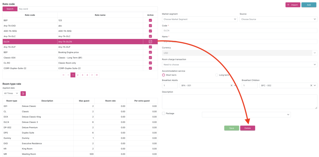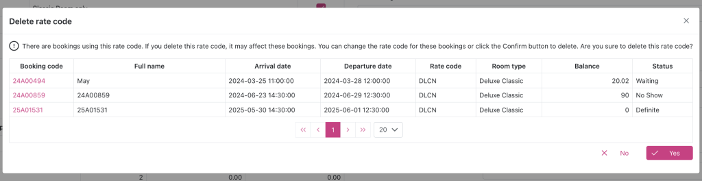 If rate code is applying booking, a pop up will display to show information of that related booking and the warning note, choose YES to delete, choose NO to cancel