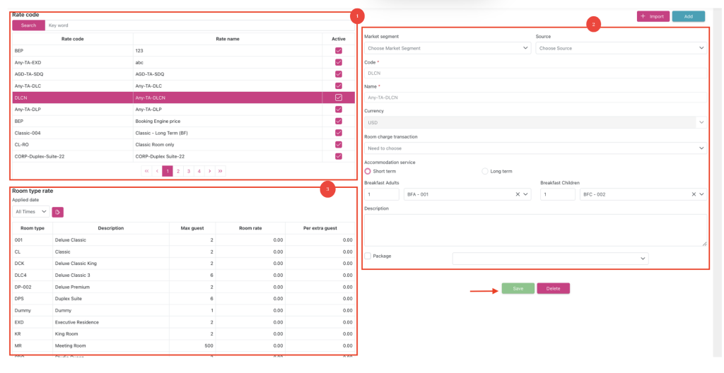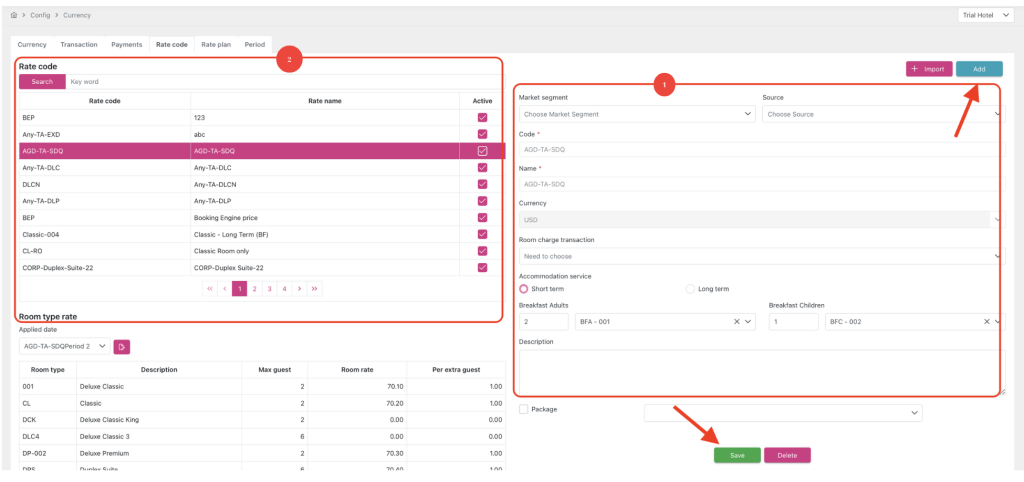 Step 1: Click Add > Fulfill information of fields in section (1) > Save, a new rate code that created will display in table (2)