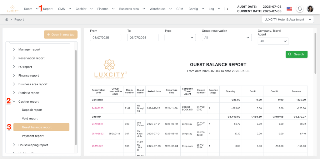 - Navigation: Report menu(1) > Cashier report group(2) > Guest balance report(3)