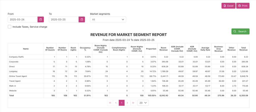 Hotels use reports to view booking statistics including: number of guests, number of bookings, number of nights stayed, room revenue, average room revenue, business area revenue, other revenue of each market segment during the search period.
