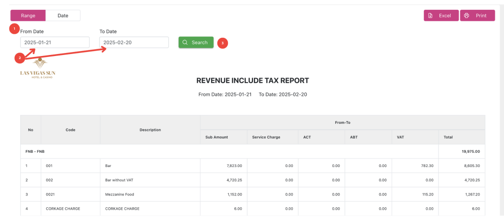 From – to column includes small columns In order: Sub Amount, Service Charge, ACT, ABT, VAT, Total