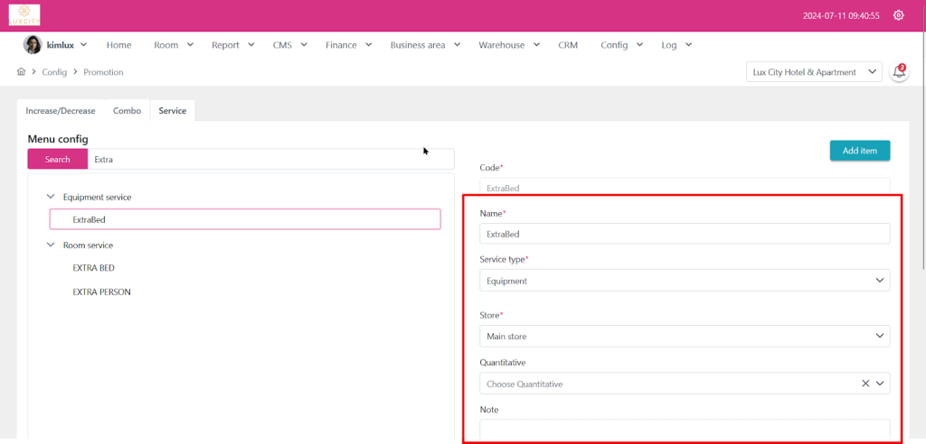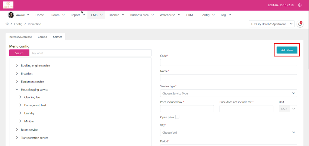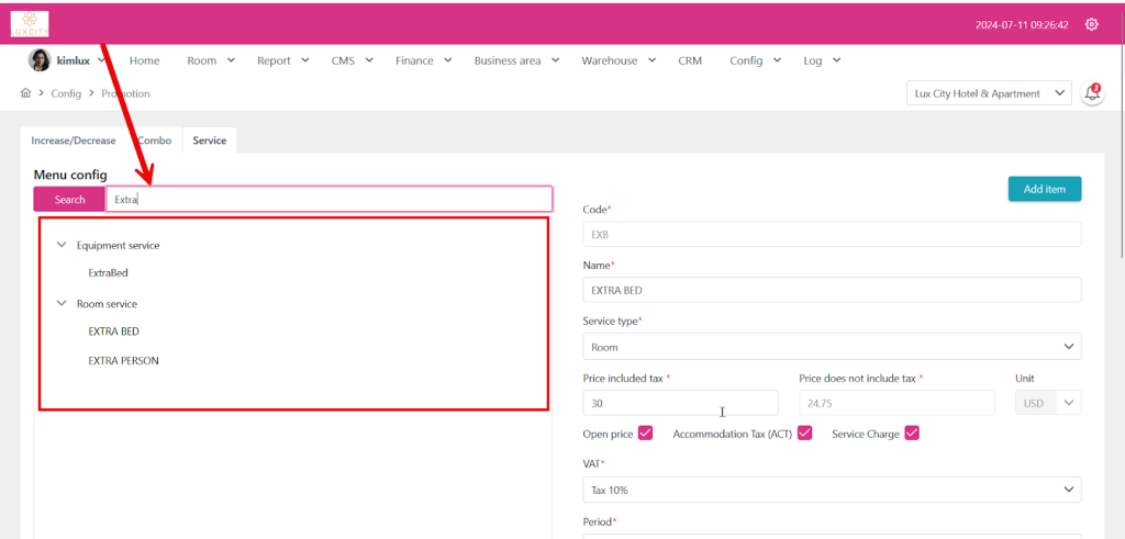 Step 1: Go to config and proceed to promotion funtion and choose “Room Service”