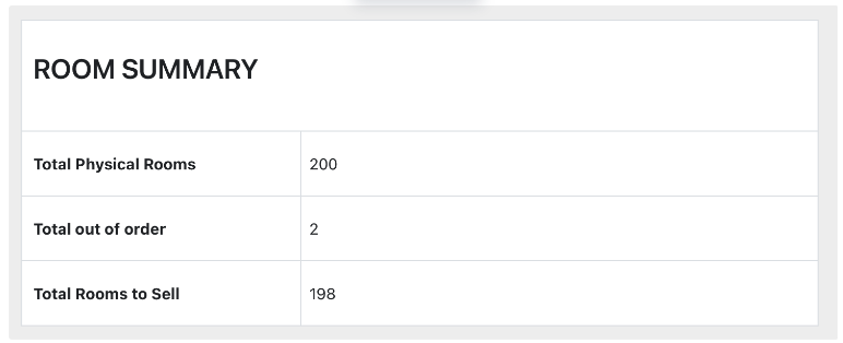 • Total Rooms to Sell: The total number of rooms available for sale, excluding Dummy rooms. The displayed value is calculated using the formula: Total Physical Rooms – Total Out of Order.