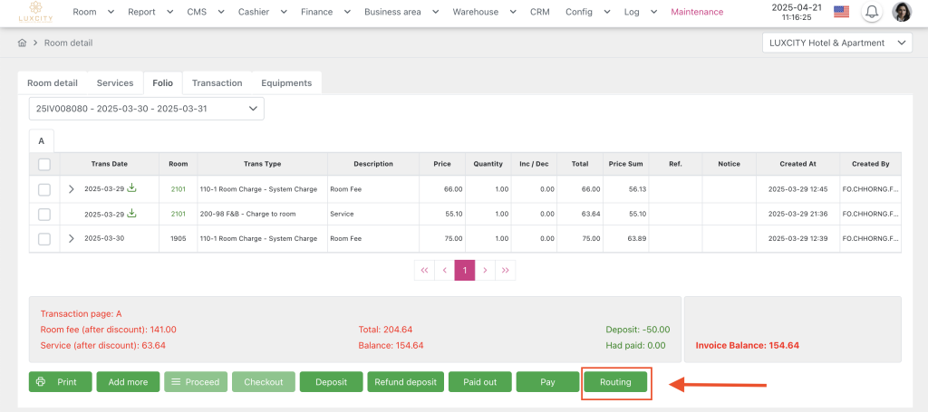 The Routing function is used to automatically transfer transactions with pre-set transaction types to a pre-selected room. Previously, after setting up routing for bookings, it was necessary to wait for the night audit to transfer the transactions. Currently, it has been modified so that routing takes effect immediately without waiting for the night audit. Transactions created after the routing is set will apply this routing, while transactions created before will not be affected.