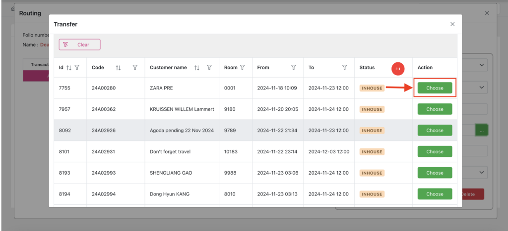 - Click the “…” icon button will show pop up to choose a in house booking (2.1) to transfer selected transaction (1) to its folio > chooseTransaction page for transferred booking > Save