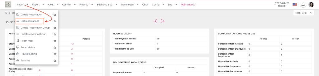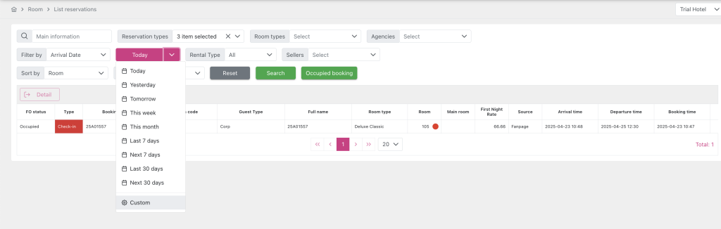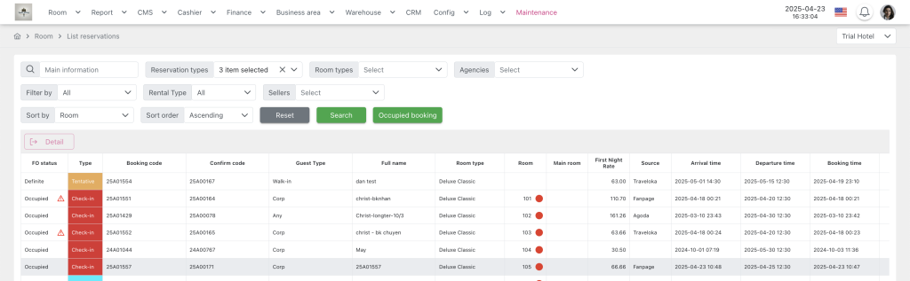 - Reservation types: Display list of reservation types (Check-in, Check-out, Definite, Tentative, Waiting, No-show, Cancel) for user to select and filter. Defaulted Re Types are Check-in, Definite and Tentative.
