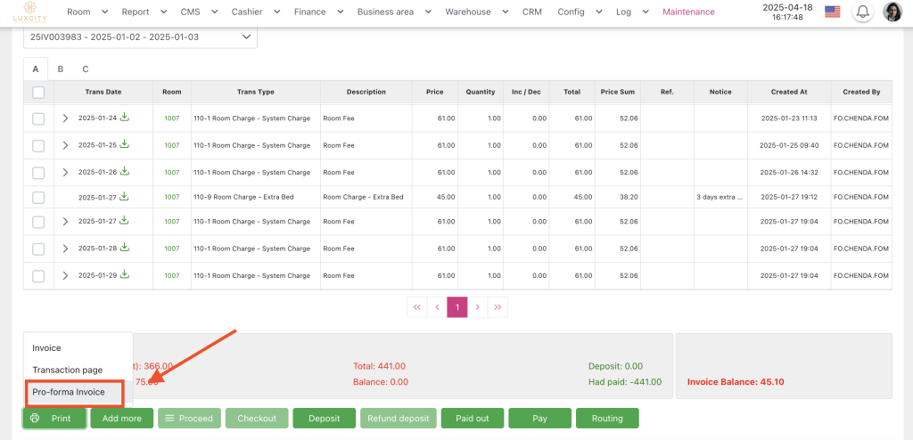 Step 2: In Room detail of booking, choose Folio tab > Print button > Pro-Forma Invoice