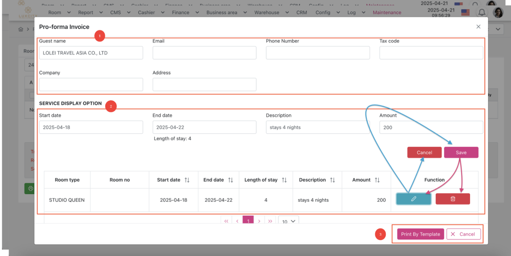 - Print by template: Click to transfer to print invoice screen