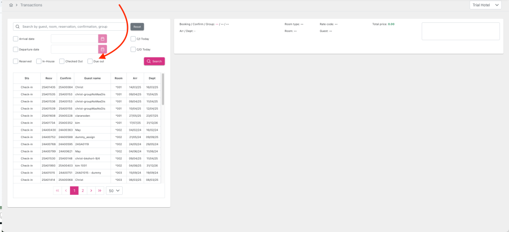 The system provides a “Due out” checkbox that allows the user to filter bookings where the expected check-out date equals the current audit date and the reservation type is not Checkout / Cancelled / No-show. When the user enables the “Due out” checkbox, only these bookings will be displayed.