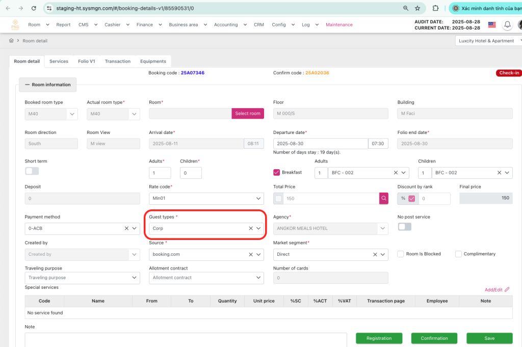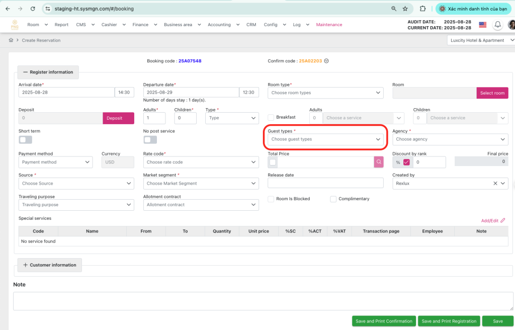 The user can create a booking without entering Guest Types in the “Register information” section. The user can edit a booking without entering Guest Types in the “Register information” section. The user can create a group booking without entering Guest Types and Payment Method. The user can view booking details even when Guest Types and Payment Method are missing, without encountering any error. The system no longer shows mandatory validation for Guest Types and Payment Method, but mandatory validation remains for all other required fields.