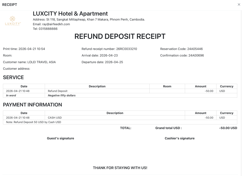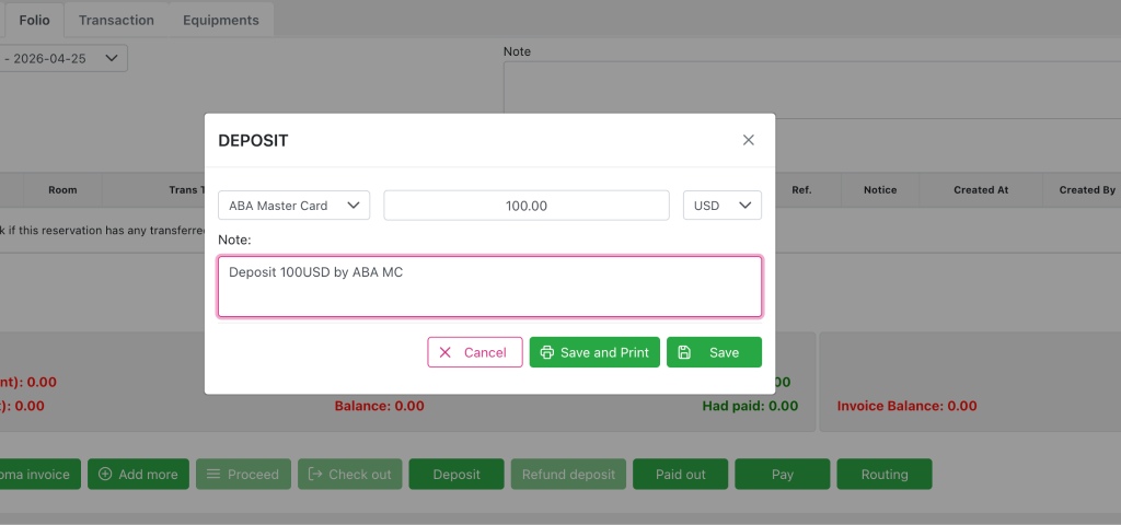 When user need to refund Deposit amount for customer, click the Refund deposit button to show Refund deposit pop up at Folio tab and select items in droplist of Refund method as customer desires, its condition as detail:
