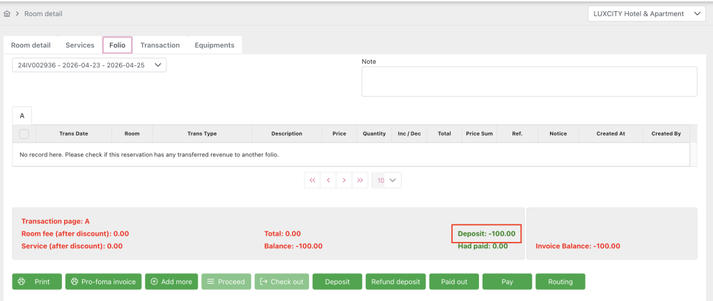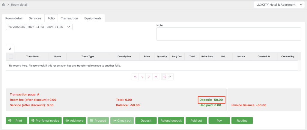 After saving, the remaining deposit amount deducts -50: